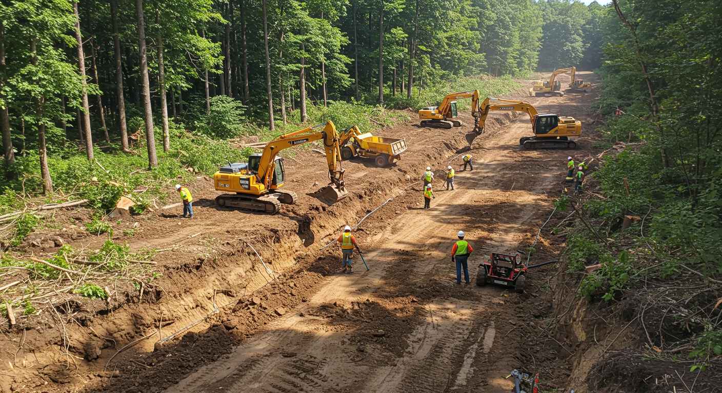 На фото показан процесс раскорчёвки участка для прокладки коммуникаций с использованием техники
