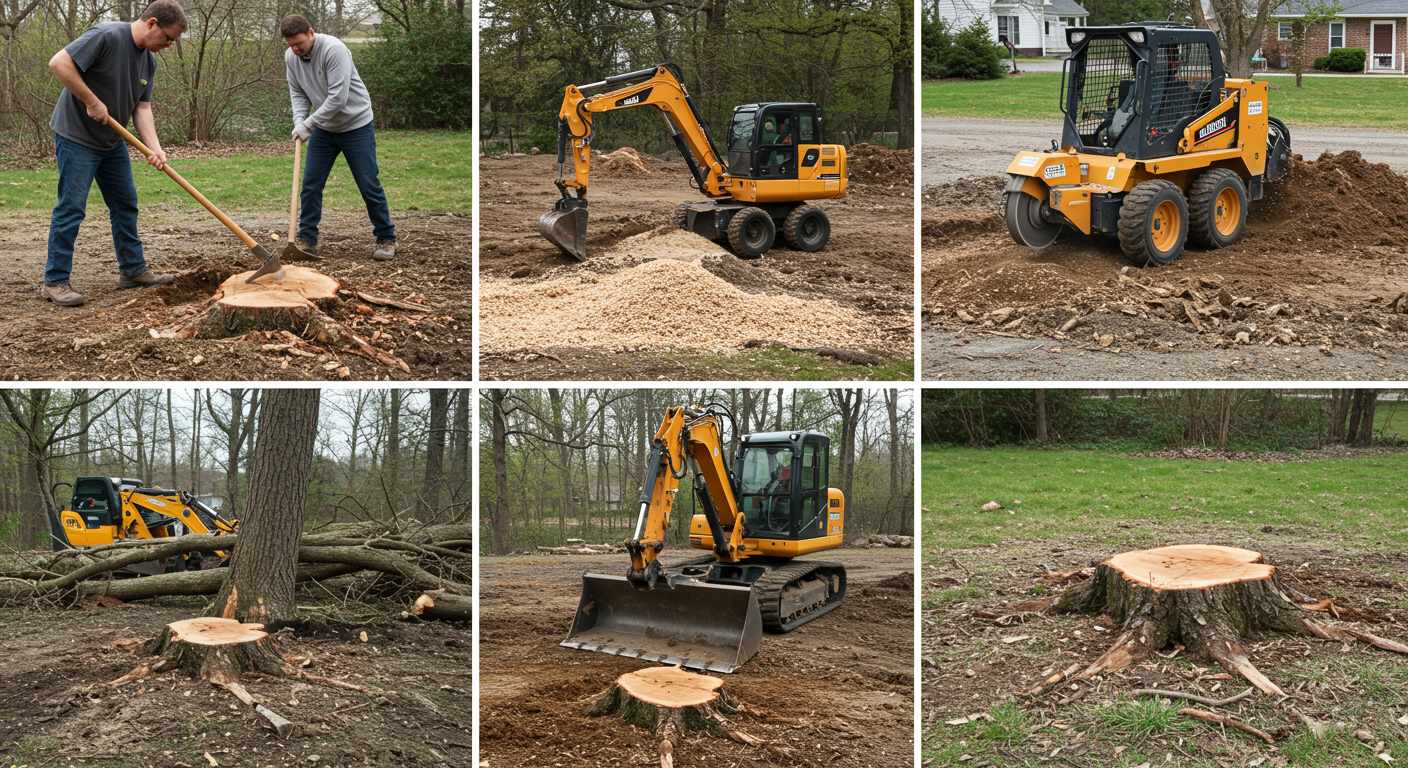 На фото показаны примеры удаления пней различными методами — от ручного до механического